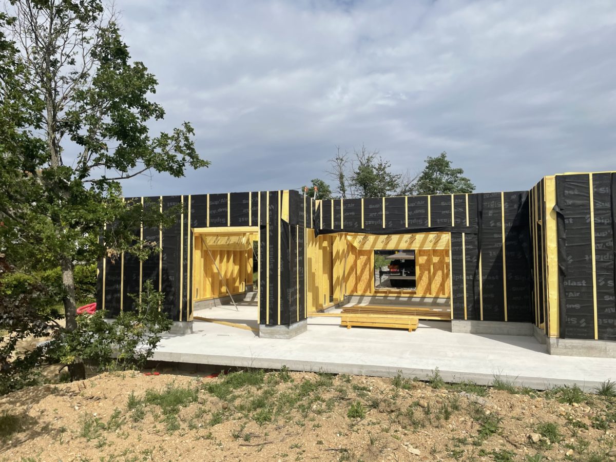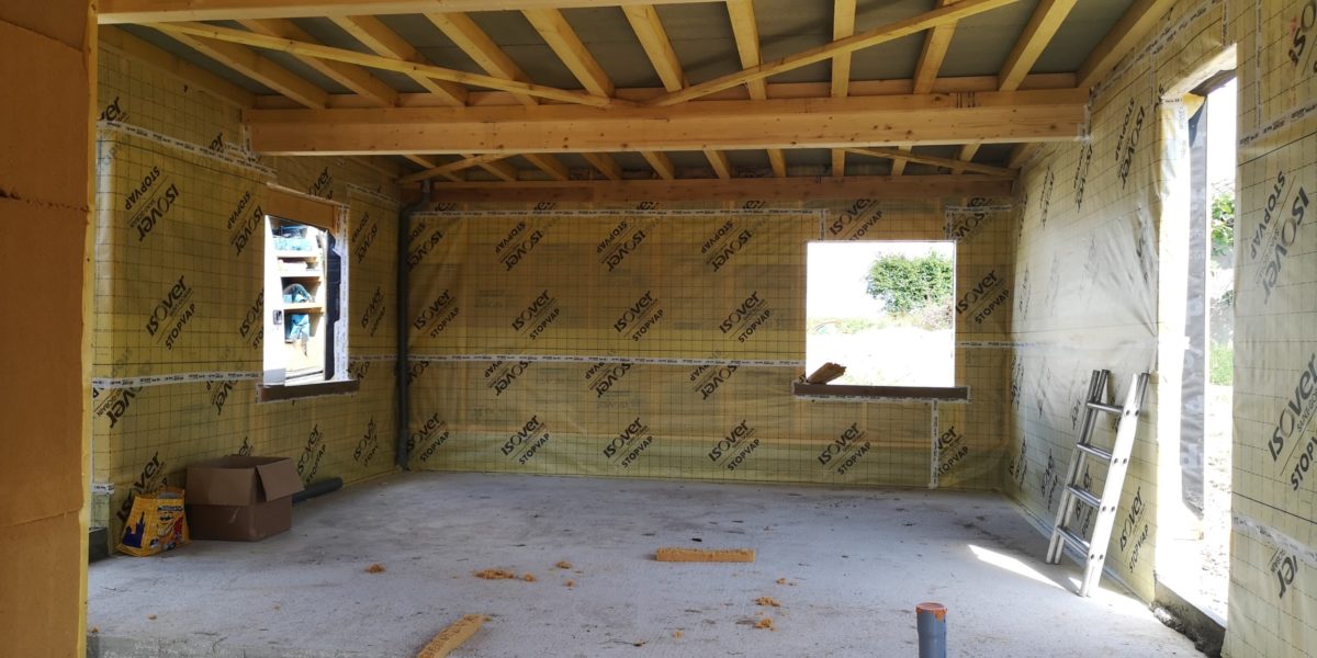 Les murs ossature Bois sont livrés et posés. Ils sont en panneaux de contreventement, avec une isolation ISOCONFORT et une membrane pare-vapeur.