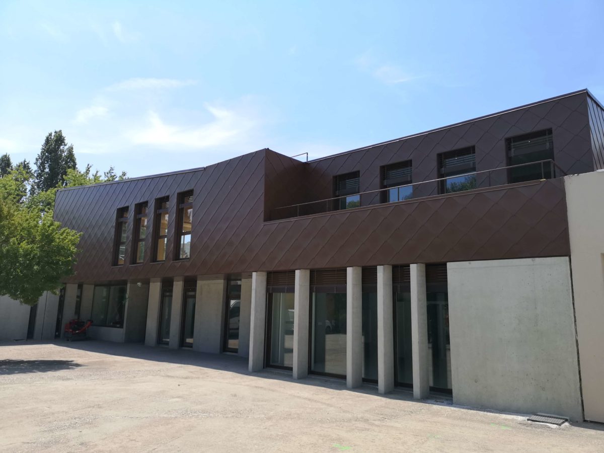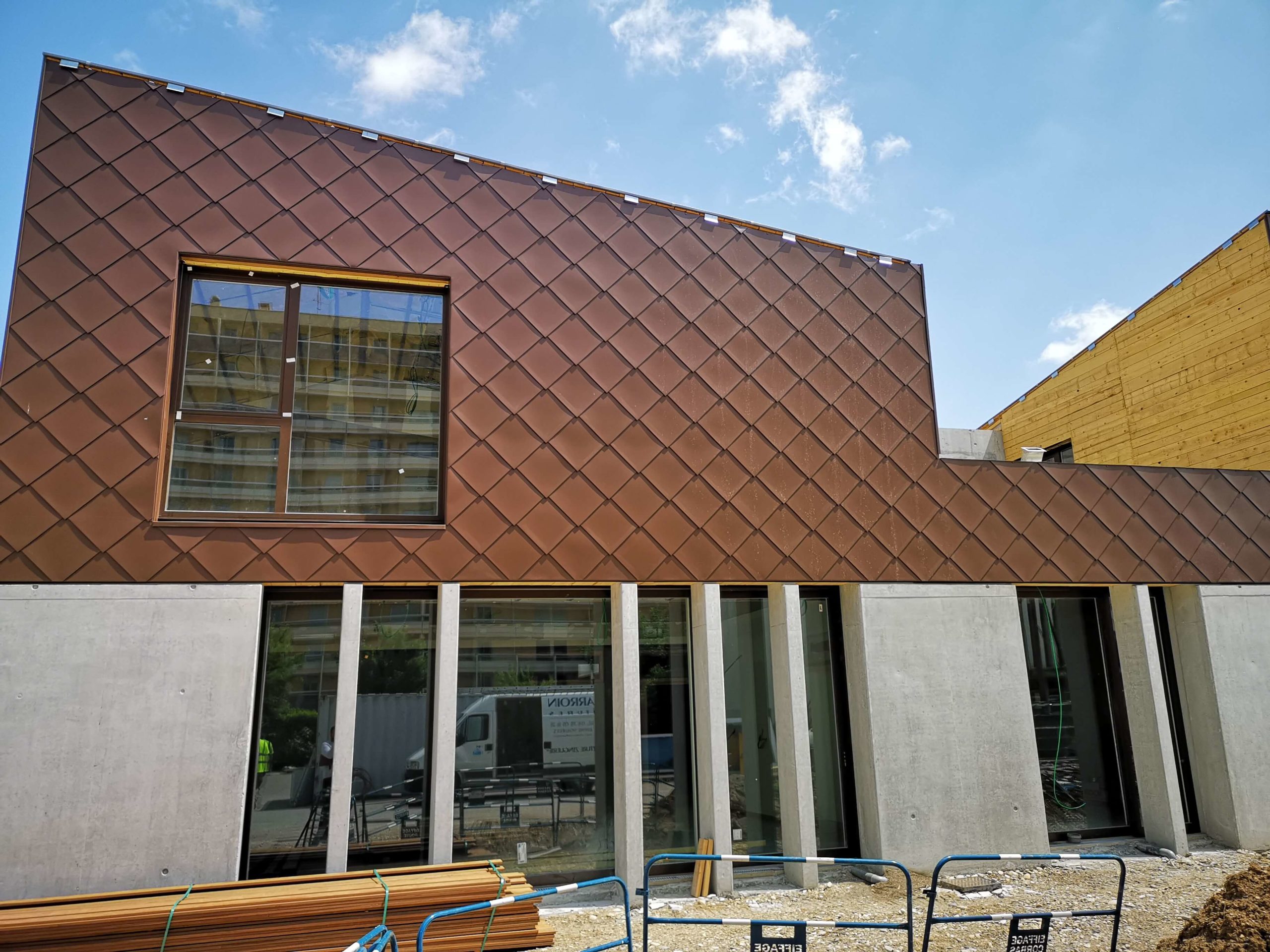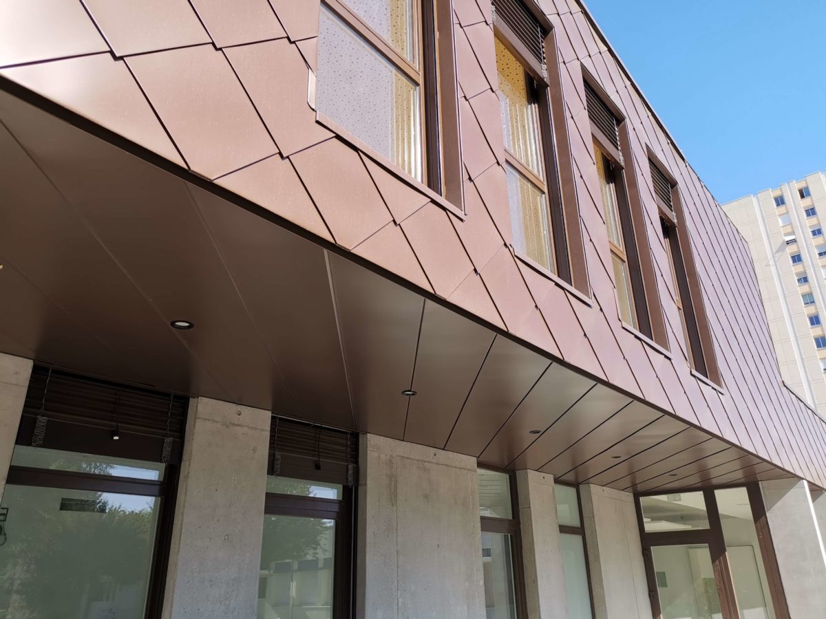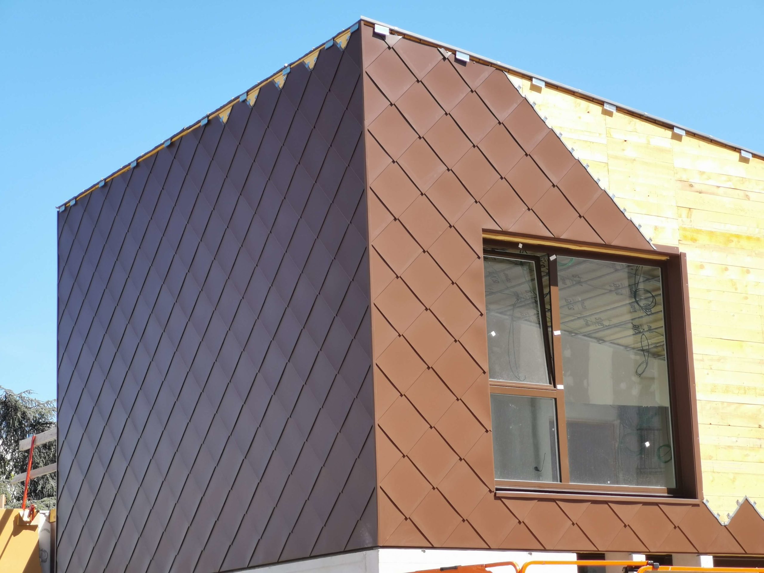 Pour finir, nous posons la Couverture en Zinc à joint debout sur la toiture et le Bardage en Ecaille Pigmento sur toutes les façades du bâtiment.