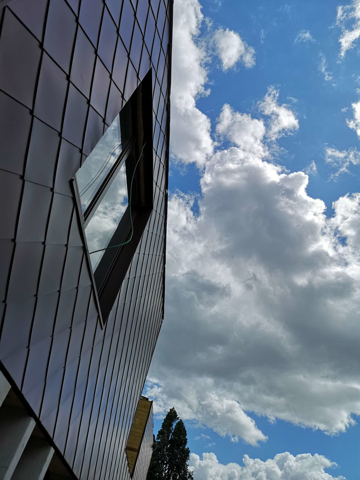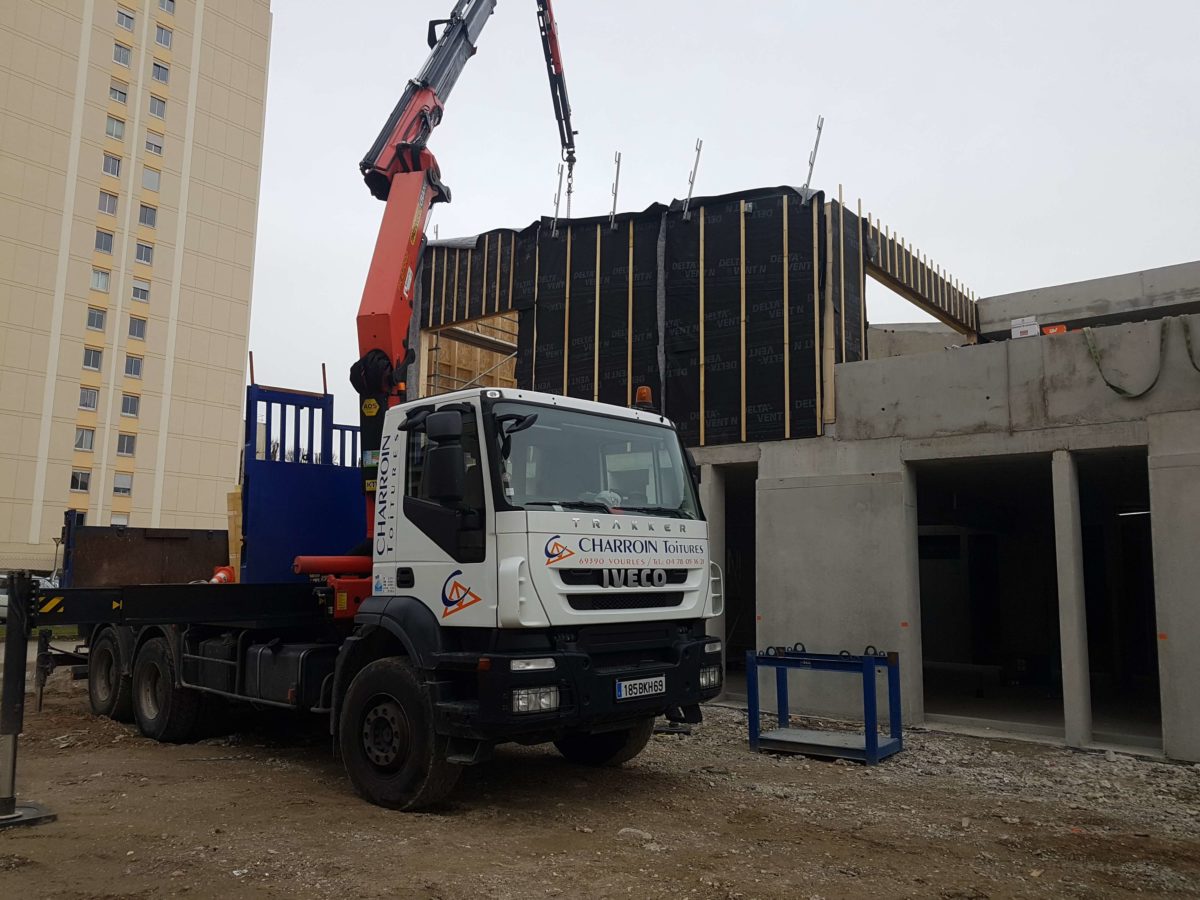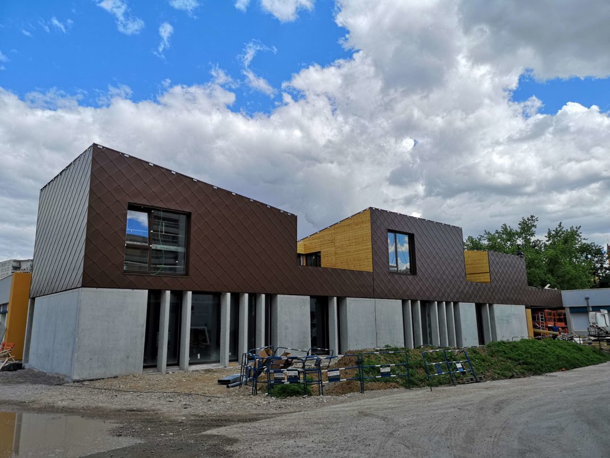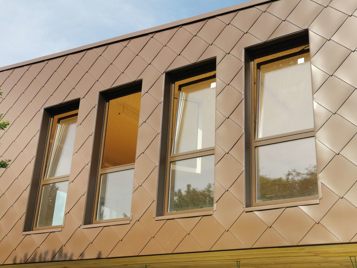 Pour finir, nous posons la Couverture en Zinc à joint debout sur la toiture et le Bardage en Ecaille Pigmento sur toutes les façades du bâtiment.