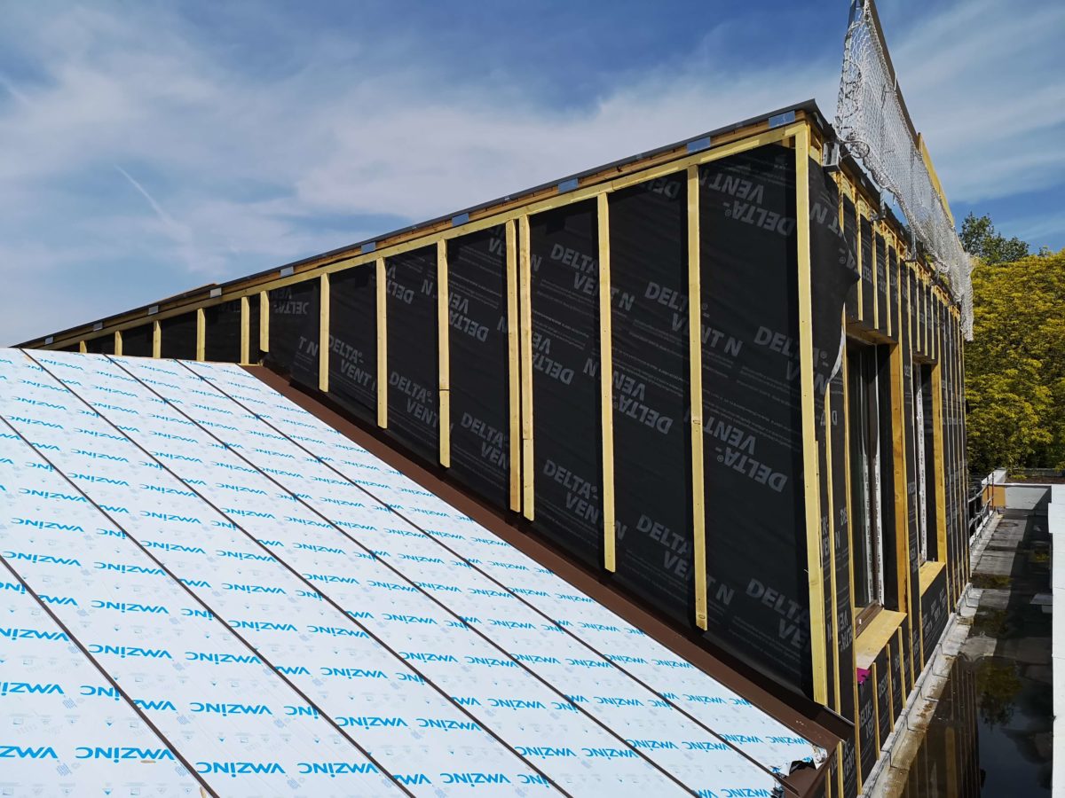 Ensuite, nous posons l’isolation des murs et des sous-toitures, ainsi que la volige en support de la couverture et du bardage.