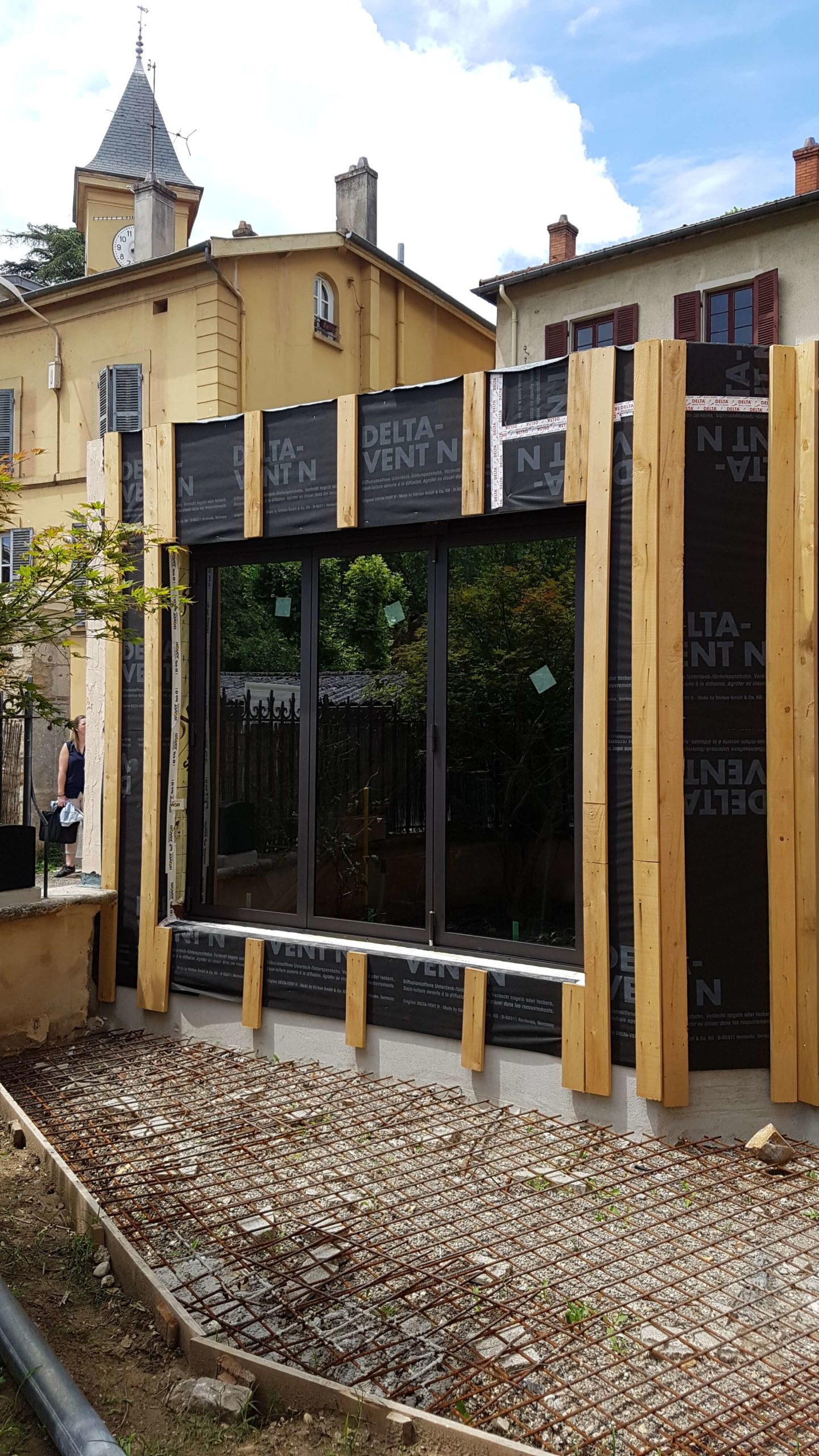 Nous avons donc réalisé un extension en ossature bois sur une maison existante. L’ossature en panneaux a été monté contre le mur existant. Les fixations ont été faîtes par scellement. En ce qui concerne l’isolation, nous avons mis en place du pare-vapeur et un écran pare-pluie.