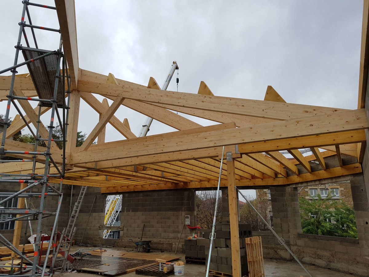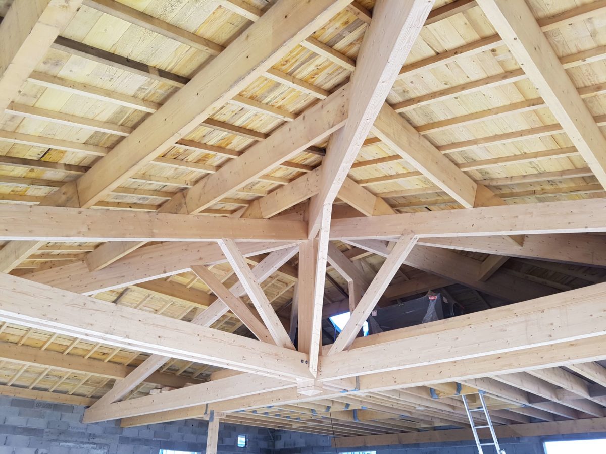 • Fabrication et pose de la charpente traditionnelle composée de fermes mixtes Bois massif et lamellé collé, de pannes, chevrons et volige en sapin.