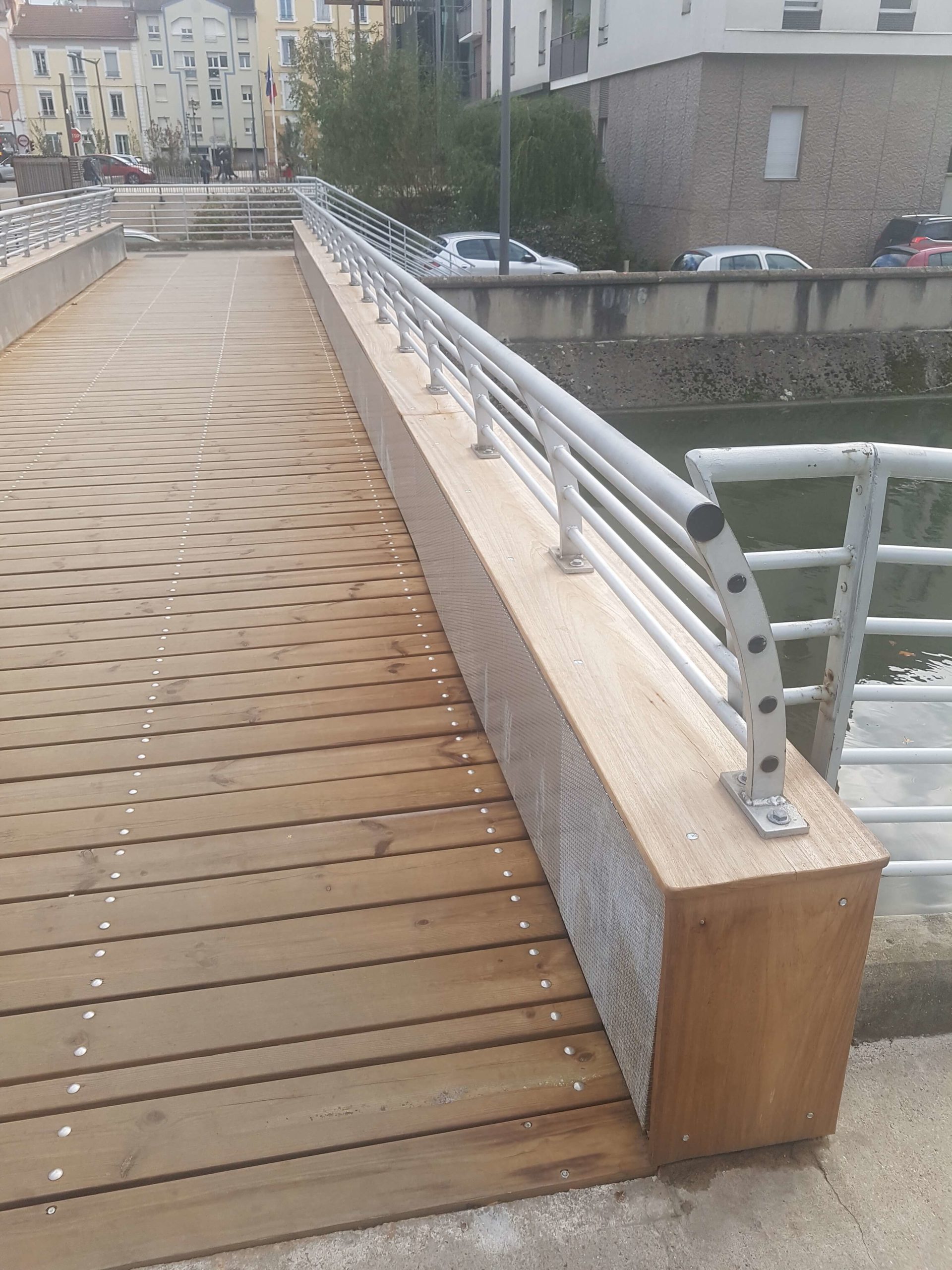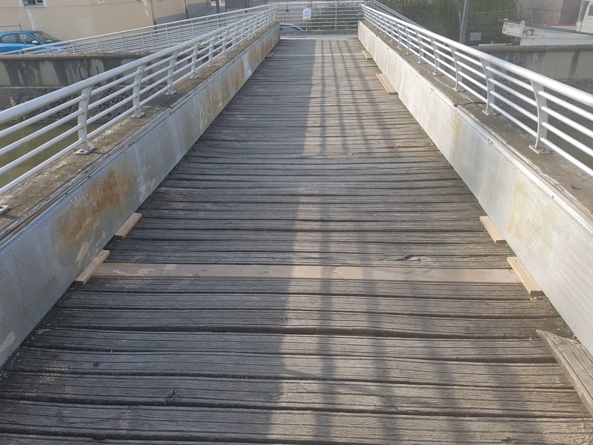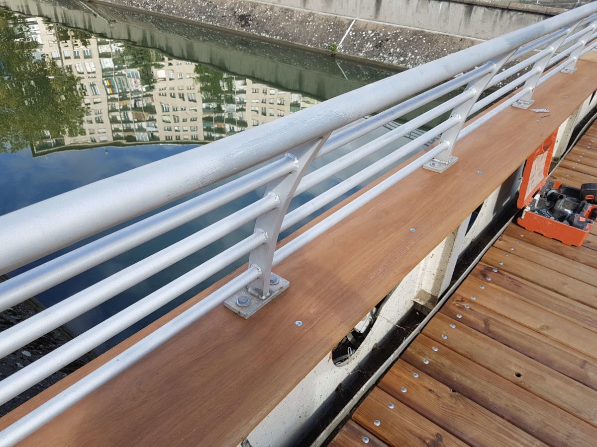 Nous avons effectué la réfection complète du platelage, plancher de charpente, de la passerelle. Nous avons également remplacé les habillages latéraux en tôle perforée ainsi que la main courante en bois.