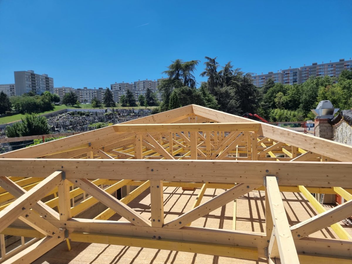 La charpente est en Lamellé Collé Epicéa et en Bois massif sapin traité.