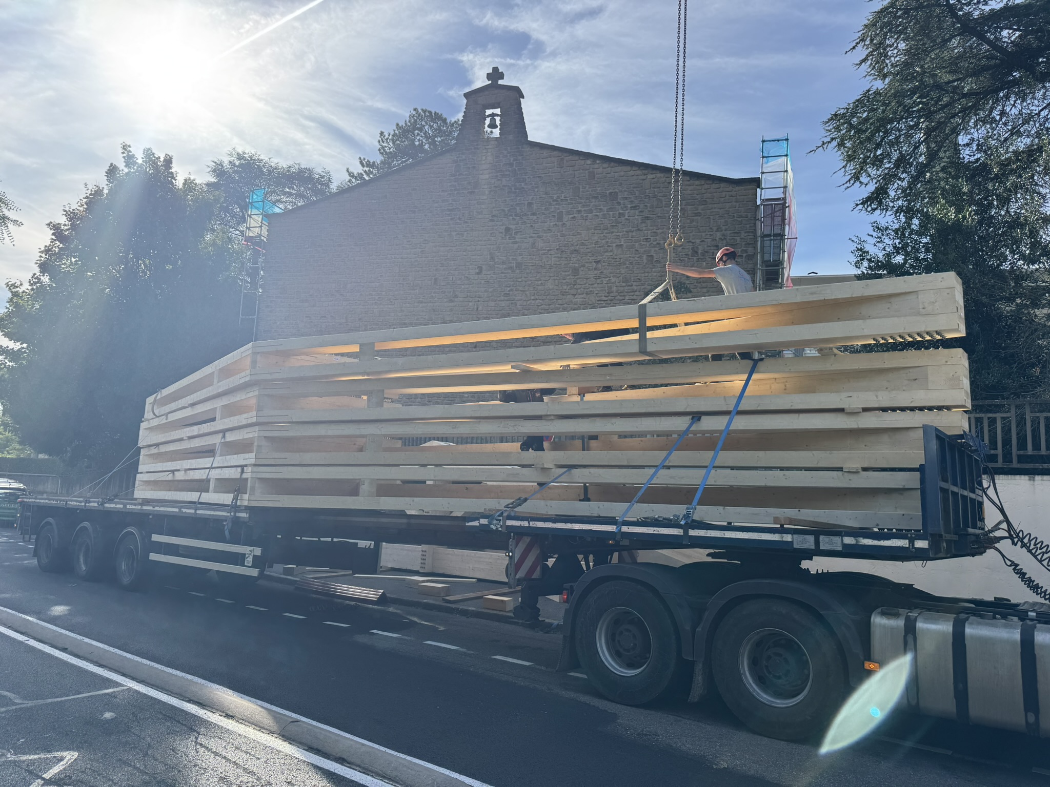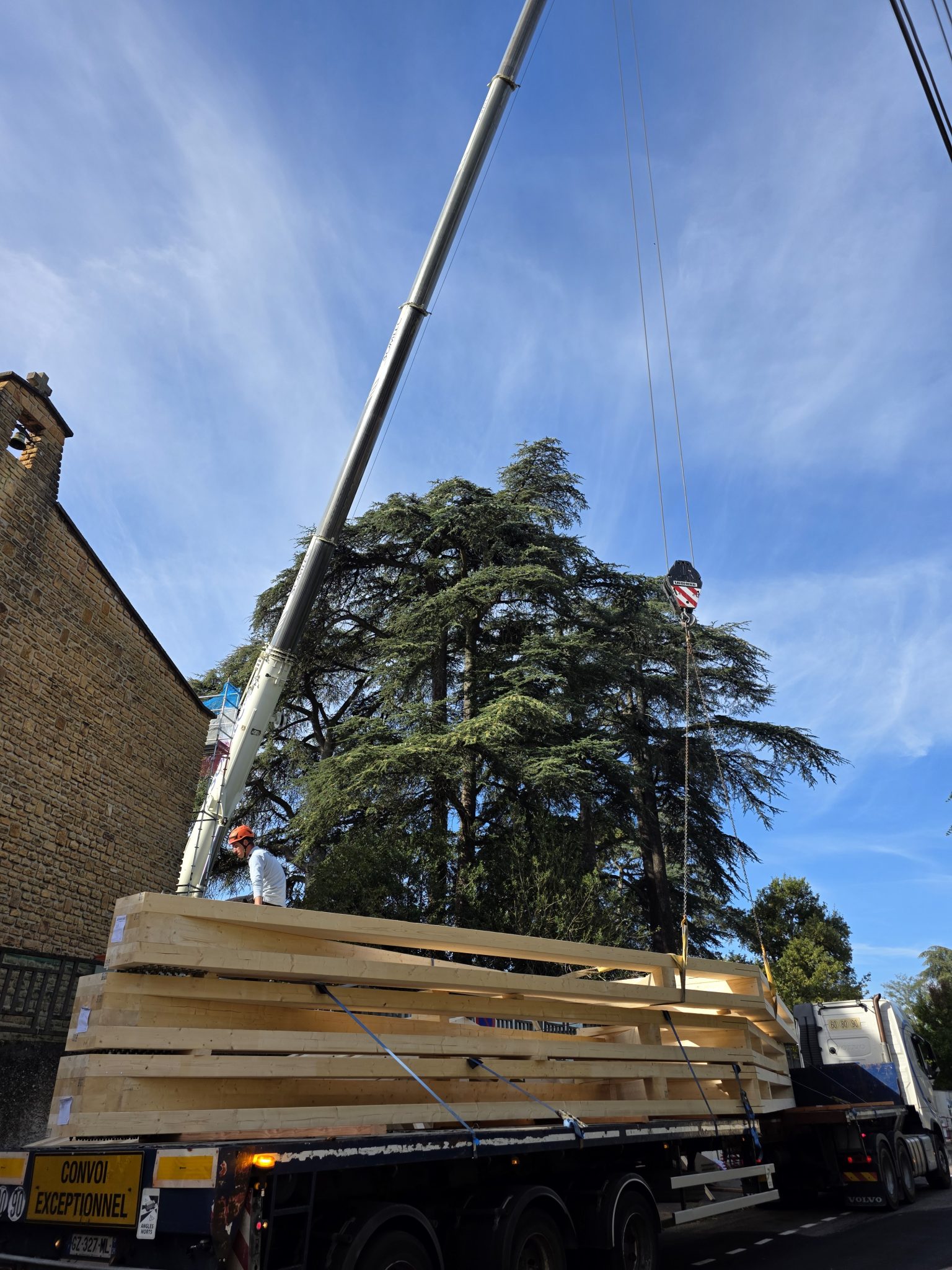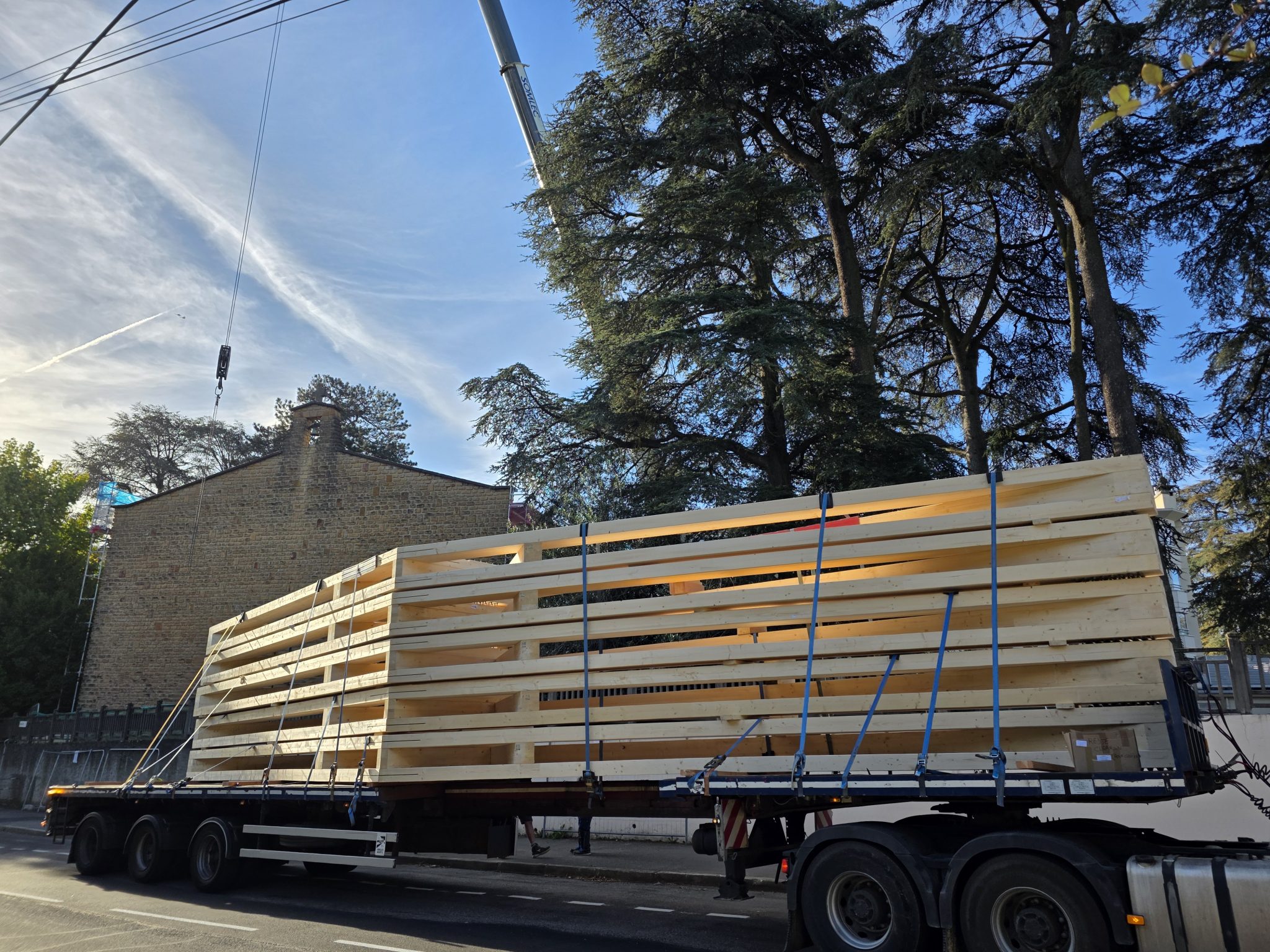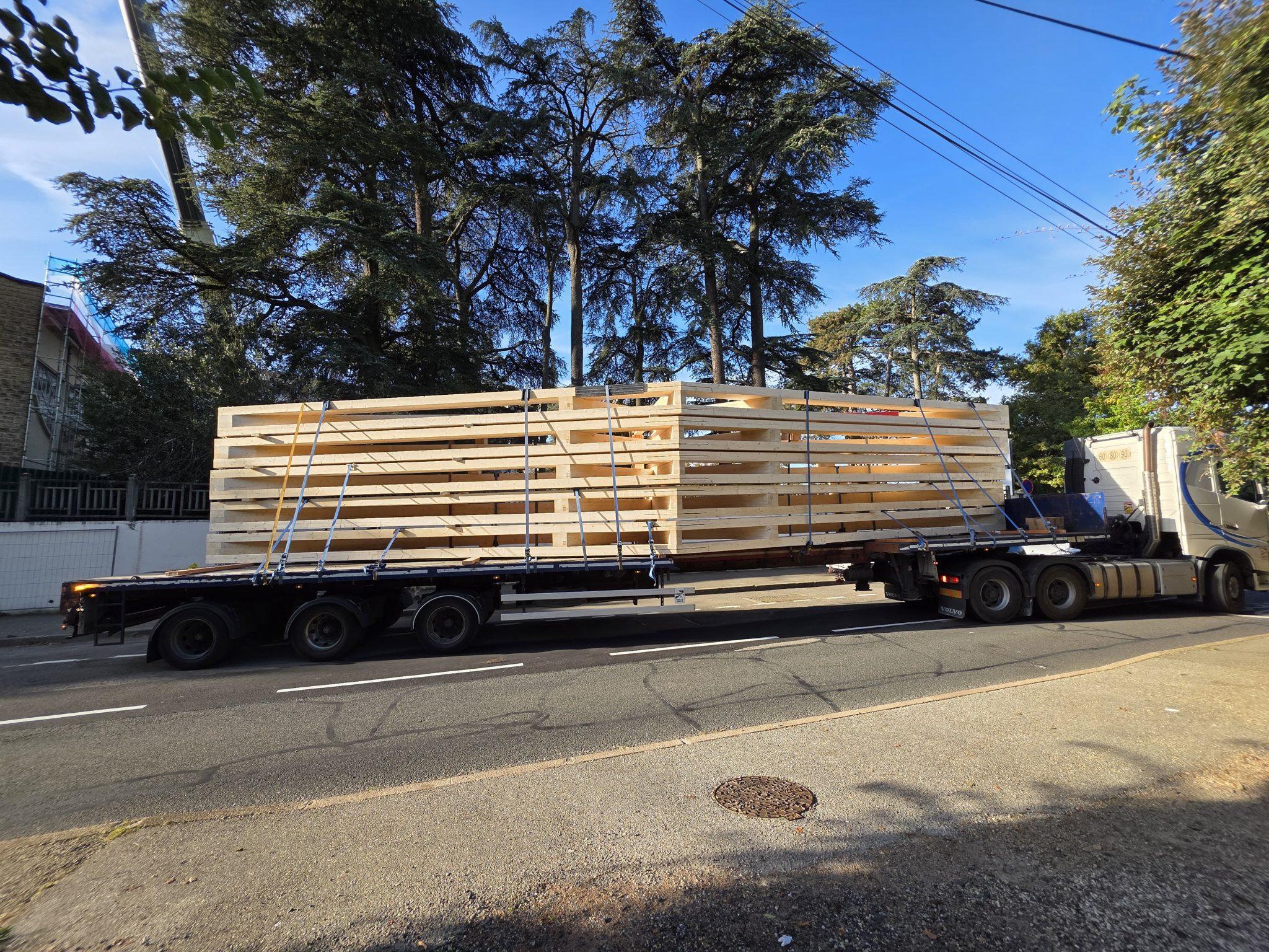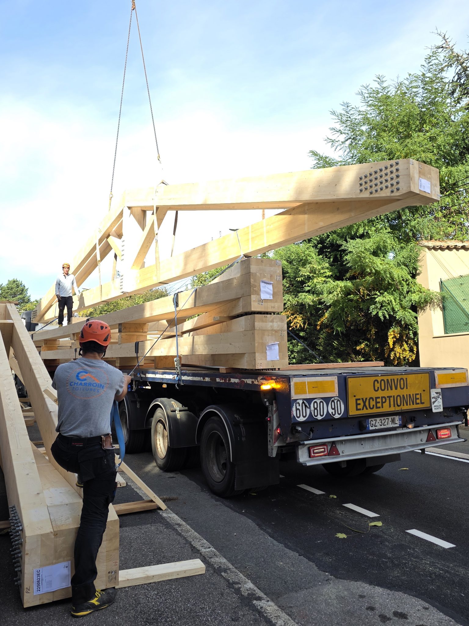 🚚 Livraison de la charpente taillée en atelier, arrivée sur site par convoi exceptionnel : un moment fort qui témoigne de l’ampleur du chantier et de la qualité du travail préparatoire.