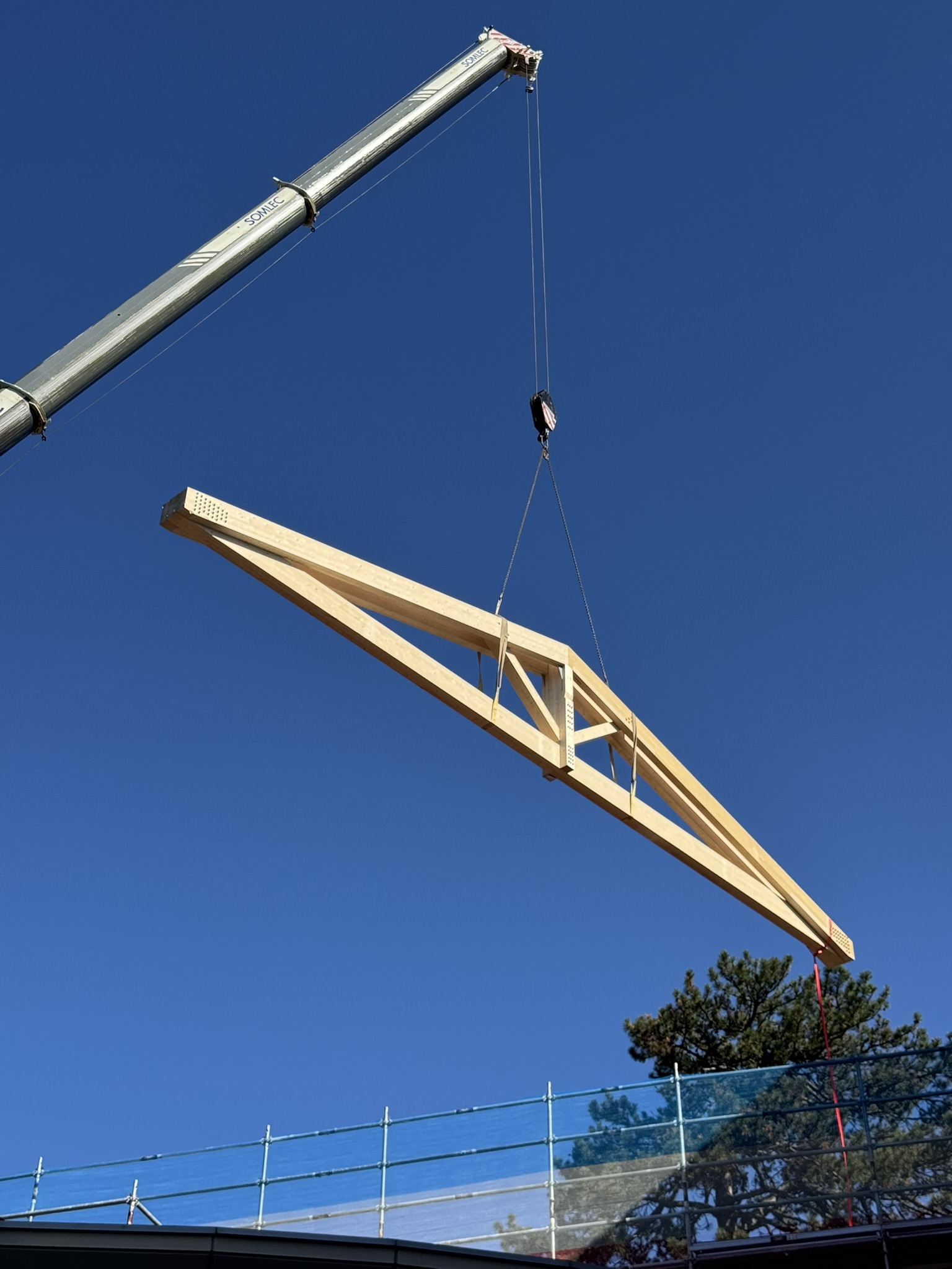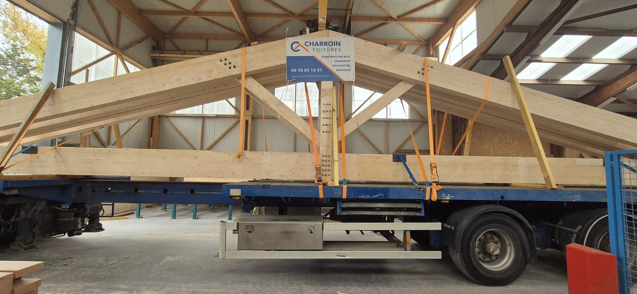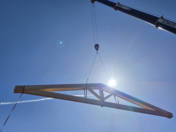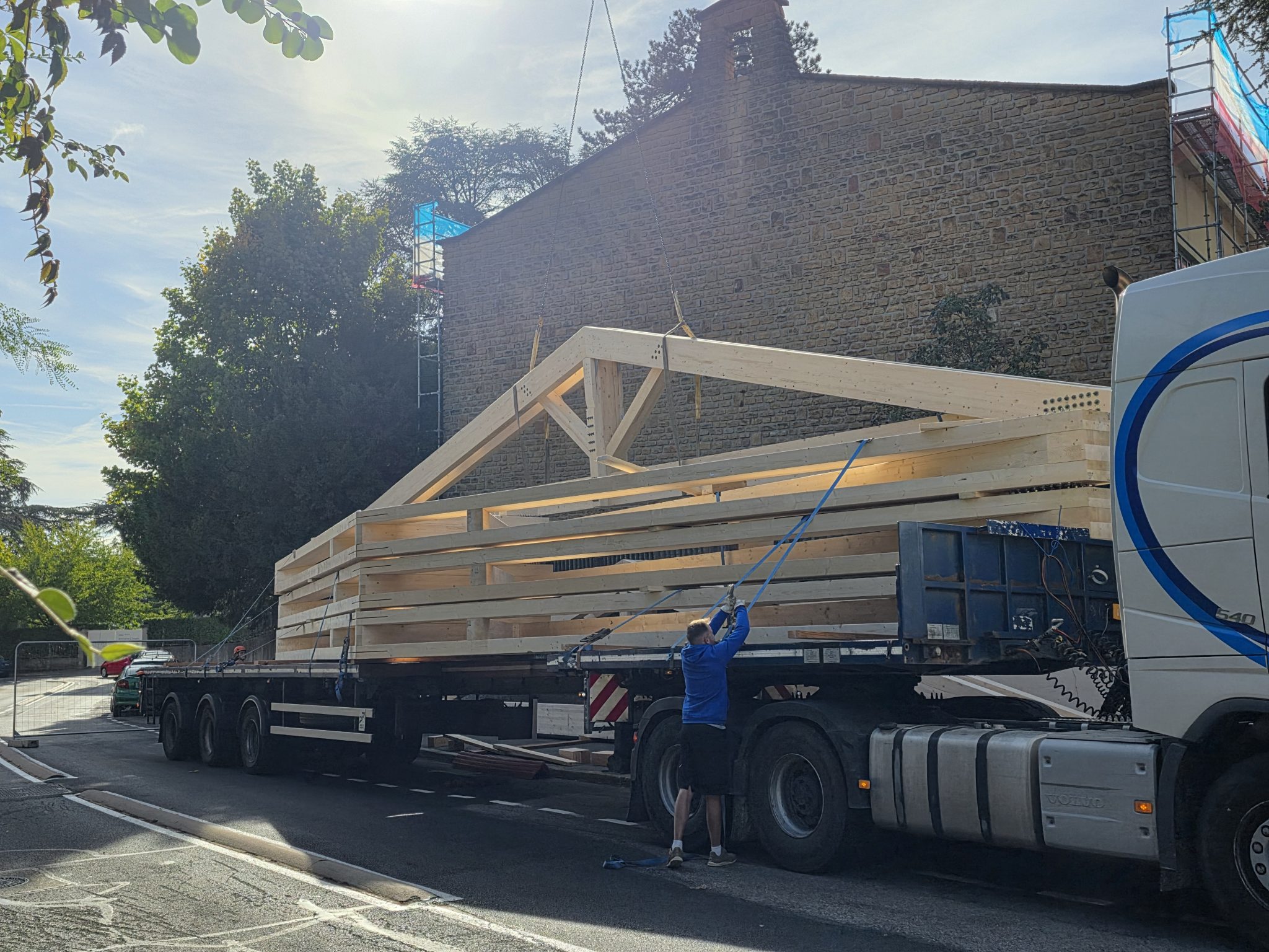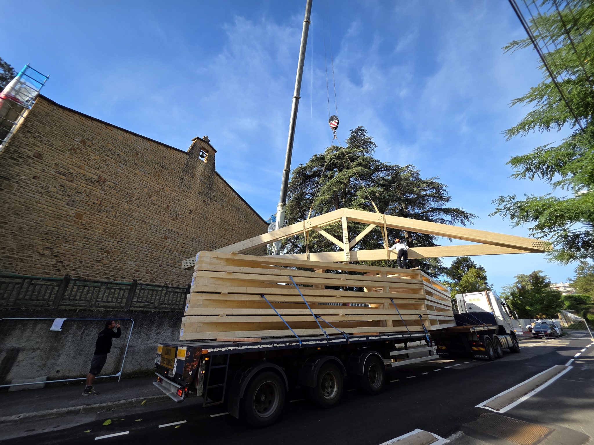 🚚 Livraison de la charpente taillée en atelier, arrivée sur site par convoi exceptionnel : un moment fort qui témoigne de l’ampleur du chantier et de la qualité du travail préparatoire.